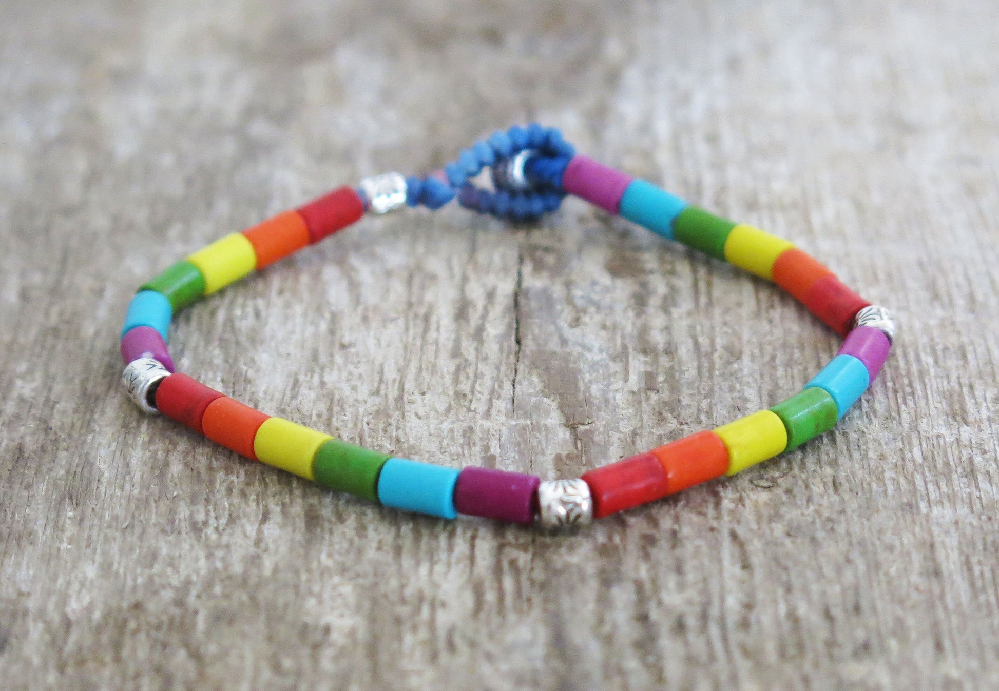 This rainbow Bracelet is made with 4/8mm Ceramic and silver-plated Alloy Beads and with and silver-plated button Clasp.